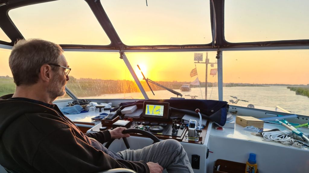 Als we richting Middenmeer varen horen we ineens een vreemd geluid van de boot. Iets geraakt, iets in de schroef? Geen idee. Als we achterom kijken zien we ook bij het achteruit slaan niets omhoog komen. Raadselachtig. Wanneer we dan maar gewoon weer vooruit kijken en Arie naar het dashboard kijkt zijn alle meters uit, stil, niks meer en ook het laadstroomlampje brand. Dat betekend narigheid maar de motor draait nog en dus gaan we snel aan de kant om te kijken wat er aan de hand is. De V-snaar?, een gebroken as? of de dynamo? Gelukkig is het euvel snel gevonden, een doorgebrande zekering. 15 minuten later maken we los en varen verder. Dit was zeker niet het vreemde geluid maar daar hebben we ook niets meer van gemerkt.