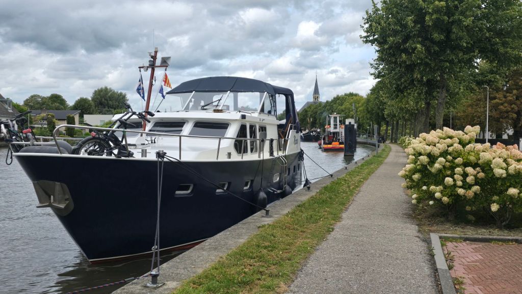 Als we door Alphen varen, komen we ook langs de afmeerplek waar we een korte tijd gelegen hebben om naar het ziekenhuis te gaan. Toen lag het helemaal vol met passanten, nu helemaal leeg. We besluiten om hier te stoppen. Gratis overnachting.
