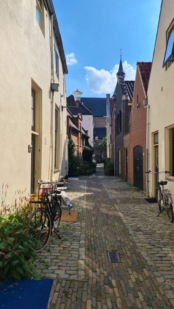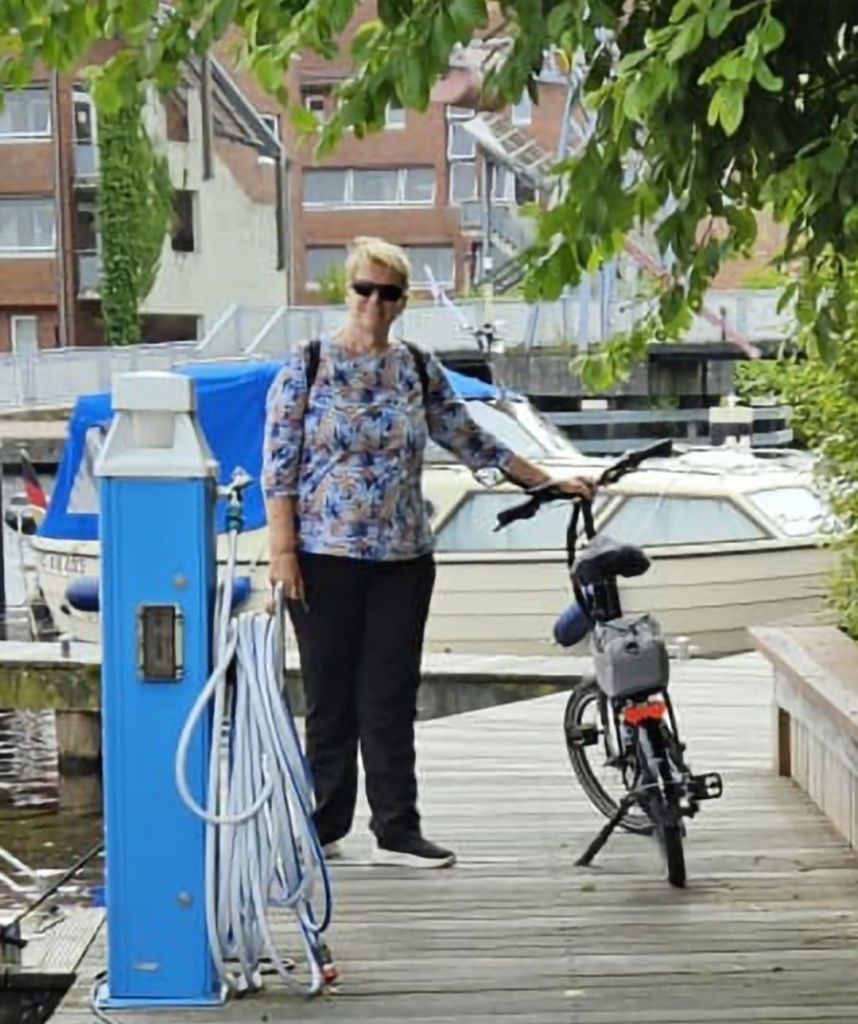 Rond 2 uur komen we aan in Hattem en meren we af in de jachthaven. Aan Marjolein appen we dat we aangekomen zijn. En in plaats van 1,5 uur met de auto naar Aarle-Rixtel, is ze nu met 2 km op de fiets zo aan boord. Na wat drinken neemt ze ons mee als gids in Hattem en ondanks dat we hier al meer geweest zijn, krijgen we nu een nog beter beeld van deze plaats.