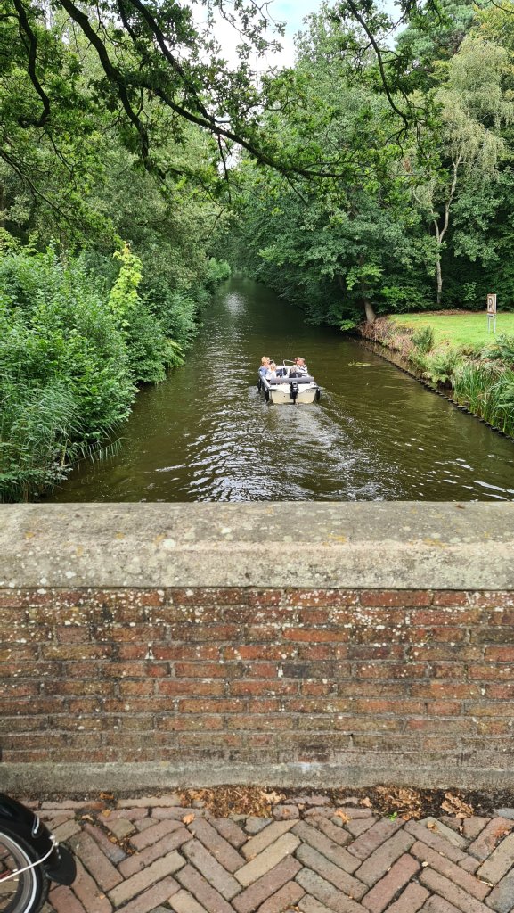 We staan op de stenen brug voor het landhuis en zien daar kleine bootjes varen.