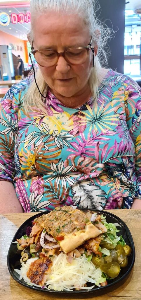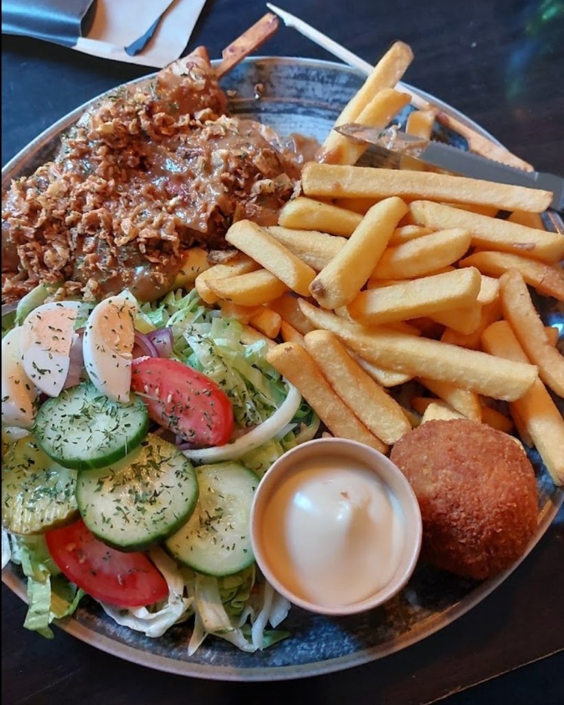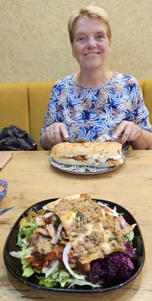 Onze dochter belt op dat het zo druk is dat haar tandemsprong uitgesteld is en of waar wij nu zijn. Nou, niet op de boot maar onderweg naar De Koog. We beloven haar te laten weten als we er zijn. We vinden een leuk eettentje en zoeken daar een tafeltje en doen onze bestelling.