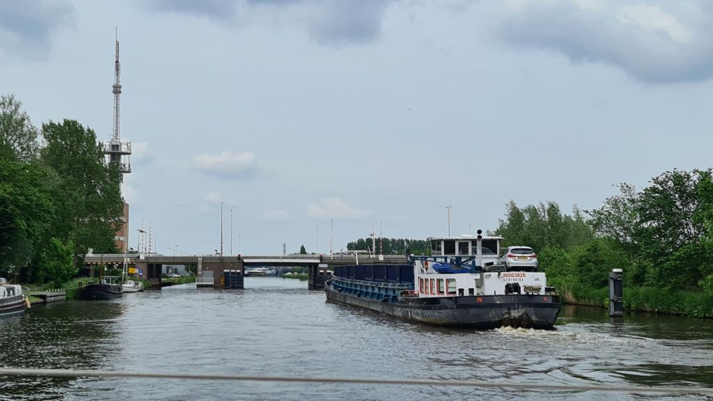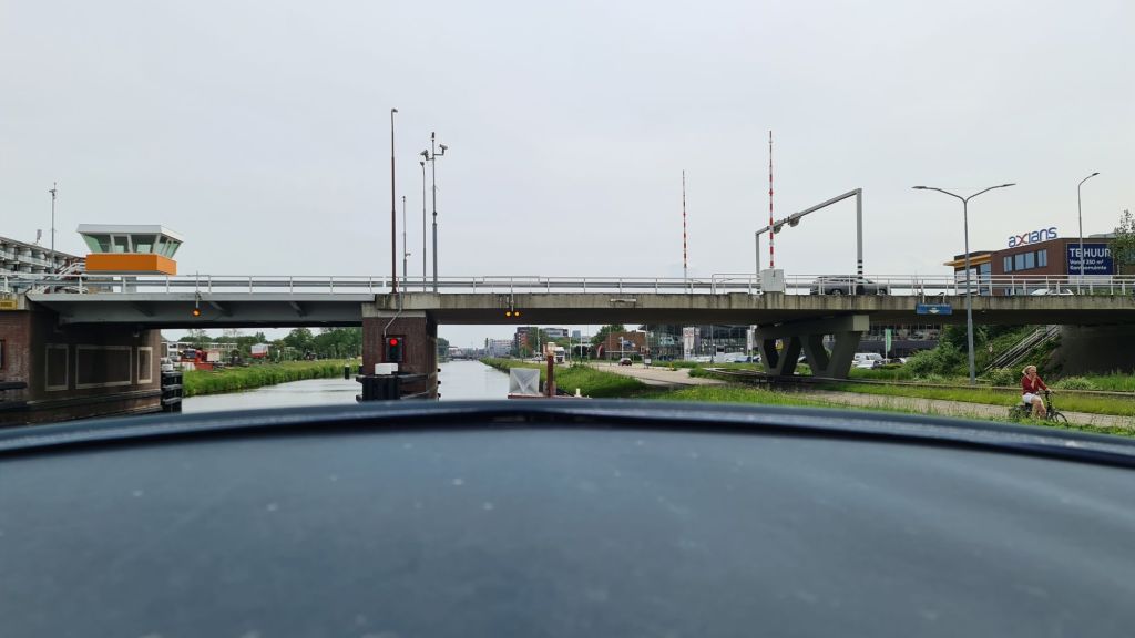 Gelukkig konden we nog net voor het vrachtschip snel onder de brug door, alleen het mastje moest naar beneden. Hier moest het vrachtschip nog wachten tot de opening. Deze brug is een onderdeel van de rondweg en het is daar altijd druk.