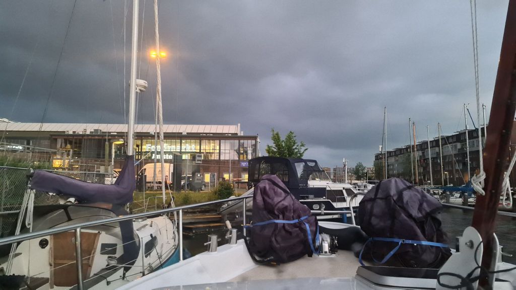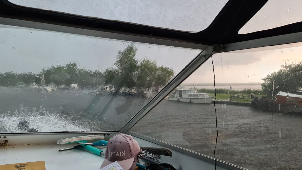 Al heel onheilspellend zien we de donkere wolken boven ons komen, de wind draait, daar hadden we met afmeren al rekening gehouden, en zien we de eerste lichtflitsen al. Niet veel later komt het met bakken uit de lucht.