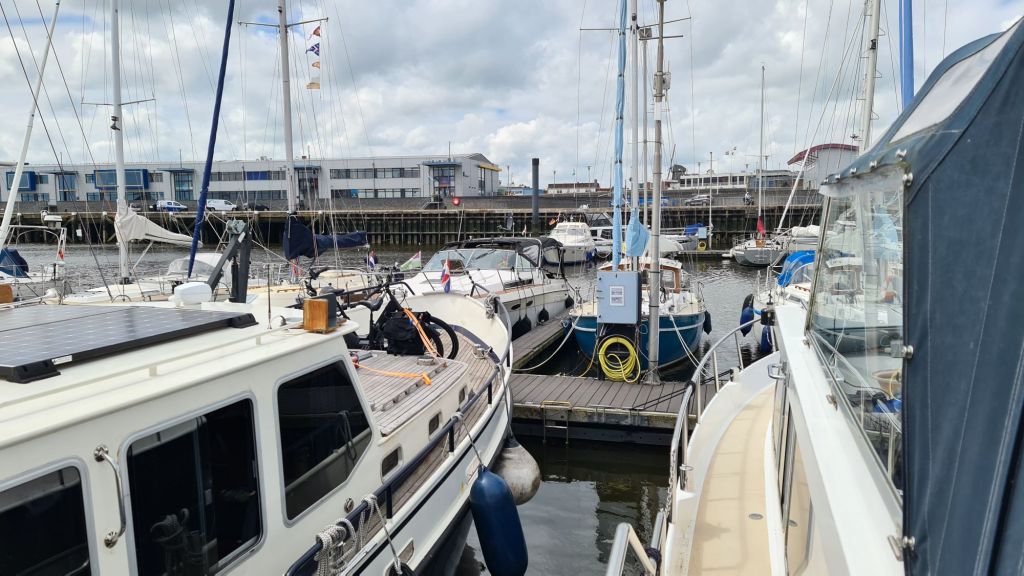 Als we eenmaal liggen dan om de beurt de vaste lijnen weer aan de steiger vastmaken. De stroomkabel aansluiten, de fietsen weer volledig inpakken en het bijbootje van voldoende sloten voorzien.