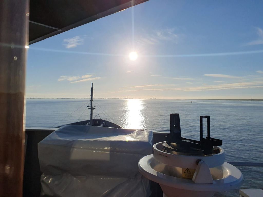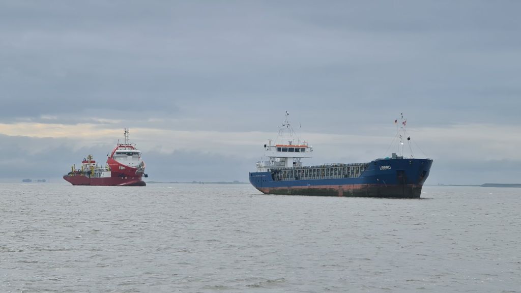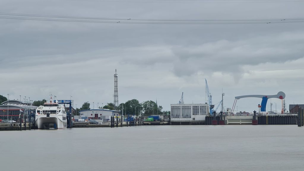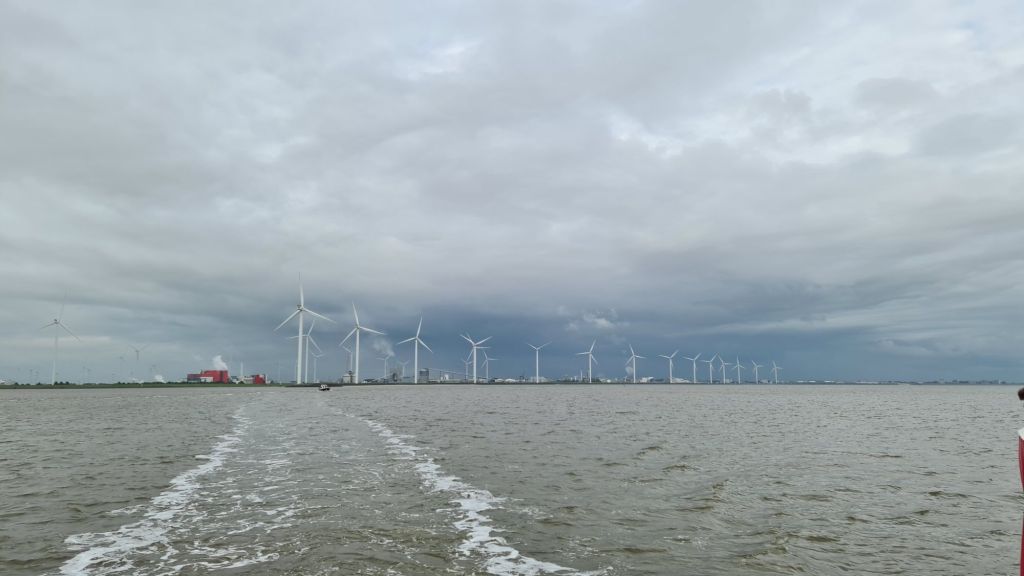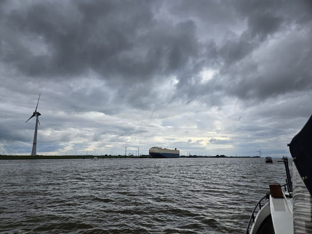 Voor anker liggendStroom en wind meeZo vroeg toch al veel vaarbewegingen.SchiffartspolizeiSkyline Emden.