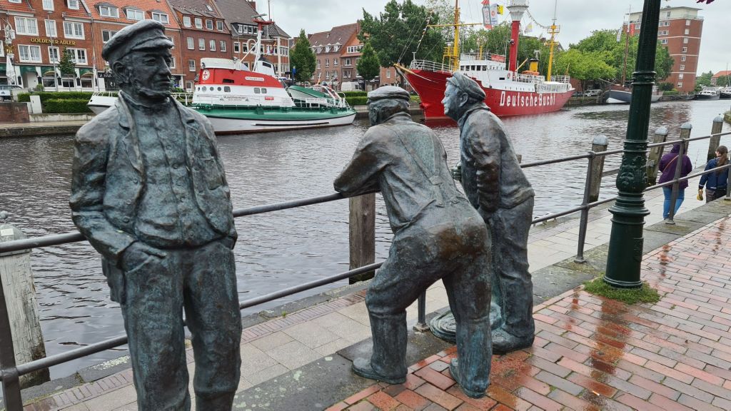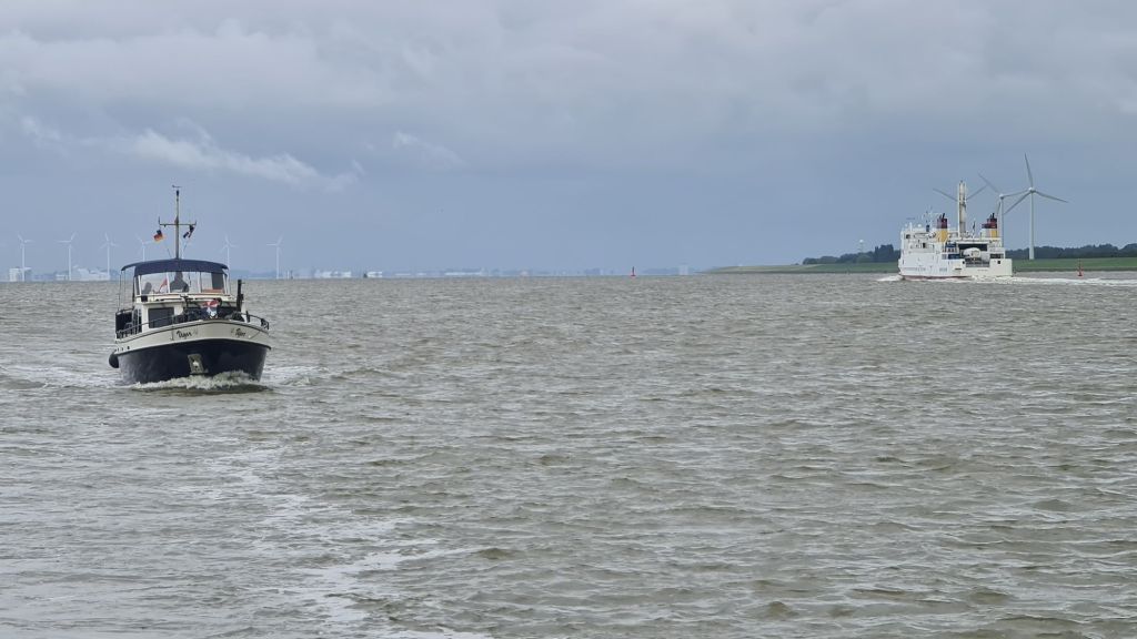 Bij het restaurant Hafenkiste staan om 9 uur de mensen al in de rij voor een frühstückbuffet. Half 10 vertrekt de rondvaartboot afgeladen vol. Rondvaart hier is heen en terug op hetzelfde Ems-Jade kanaal. Ik geniet op ons achterdek van een koppie thee en een duits bolletje.