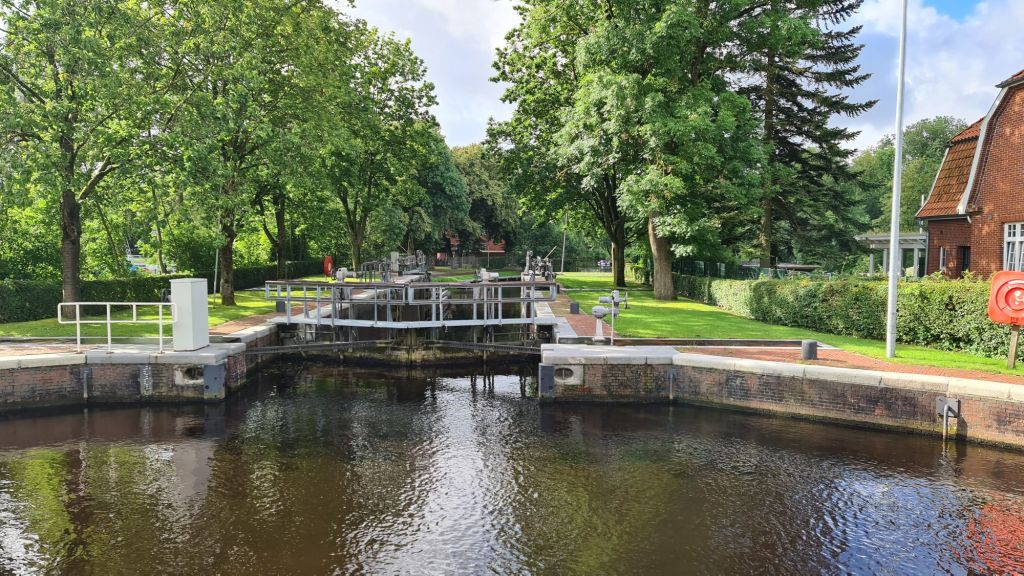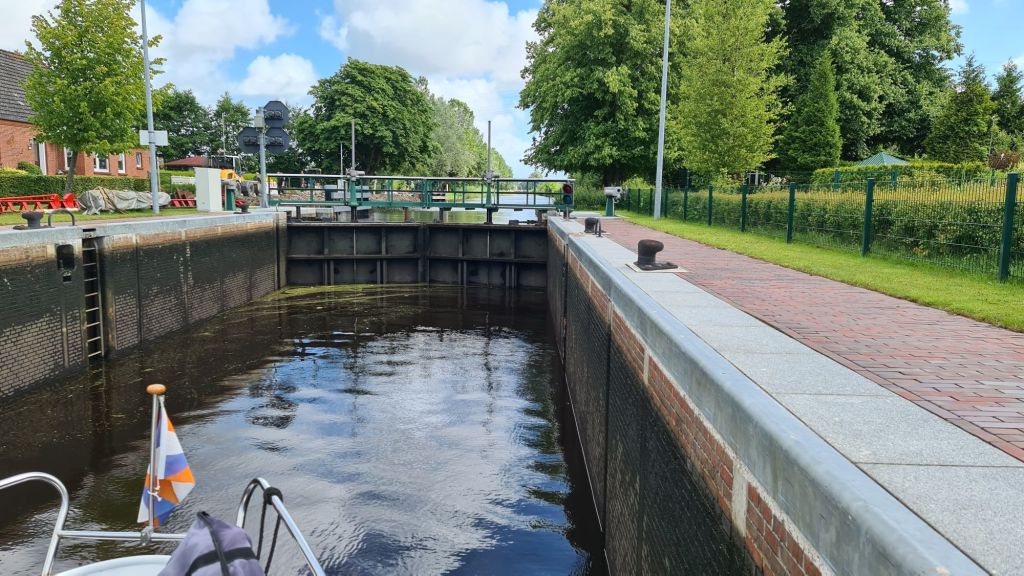 Deze sluis heeft een kruising van 2 waterwegen. De kom is rond met een verval van beide watertjes. Aangezien de meeste schepen over het Ems-Jade kanaal varen staat aan deze kant de sluis open. Nu hoefde alleen de draaibrug open.
