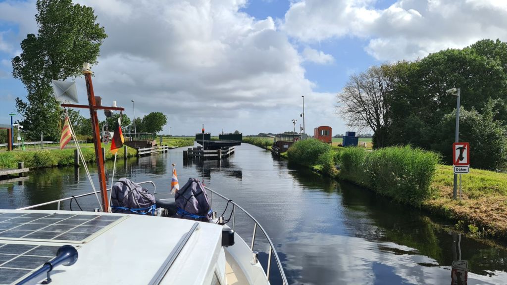 Voor ons rechtdoorgaandDe ronde kom met rechts ook sluisdeuren.Verval onbekendMooi weer om te varen.Dreigende wolkenBrug nr. ZoveelHet Ems-Jade kanaal van Emden naar Aurich.Een draaibrugOnvoorstelbaar snel worden alle bruggen bedient. Deze ging wel heel vroeg open.De lucht klaart op en we hebben zalig weer.Een prachtige omgeving om te varen.Schleuse Rahe.