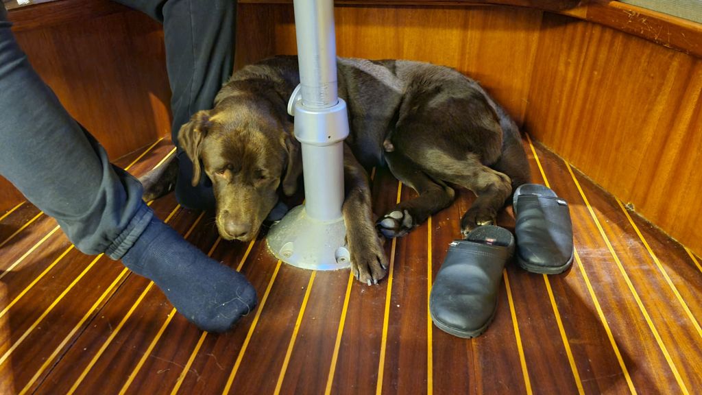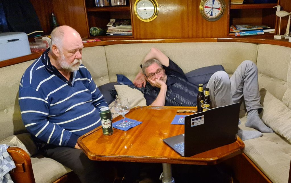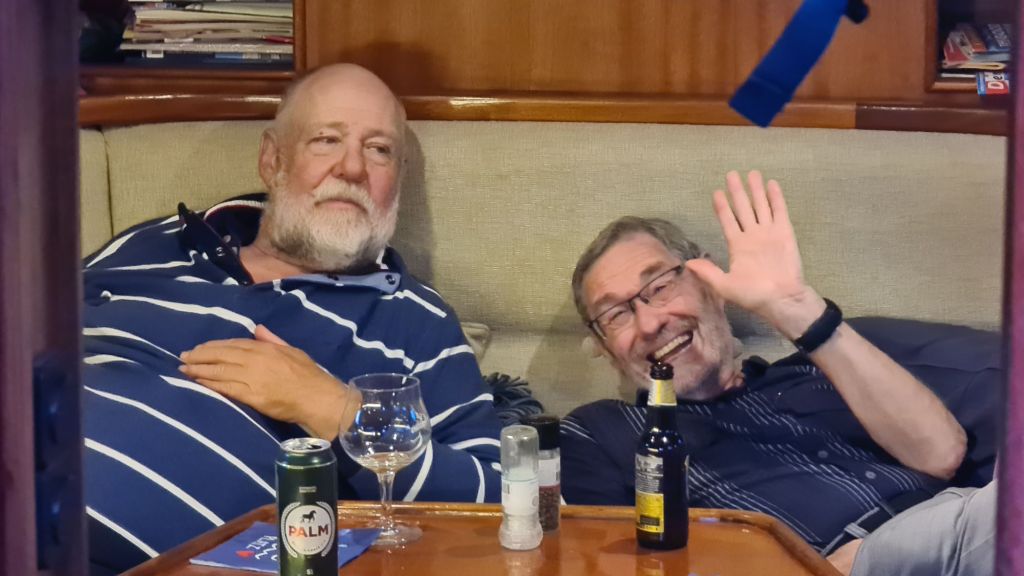 Rond het middaguur krijgen we de Texelse vrienden Lange Ben en Helga op bezoek, het weer is niet lekker, harde wind en een stuk kouder dan gister. We zitten dan ook binnen in plaats van op het achterdek.