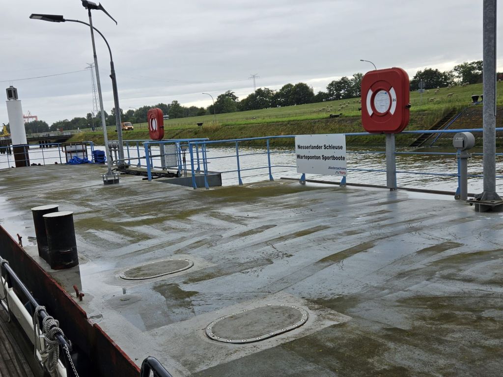 Een kaal staal ponton en niet aan de kant kunnen om de hond uit te laten.Lex met lede ogen10 uur eindelijk de sluis in.NesselanderschleuseEn natuurlijk regent het.
