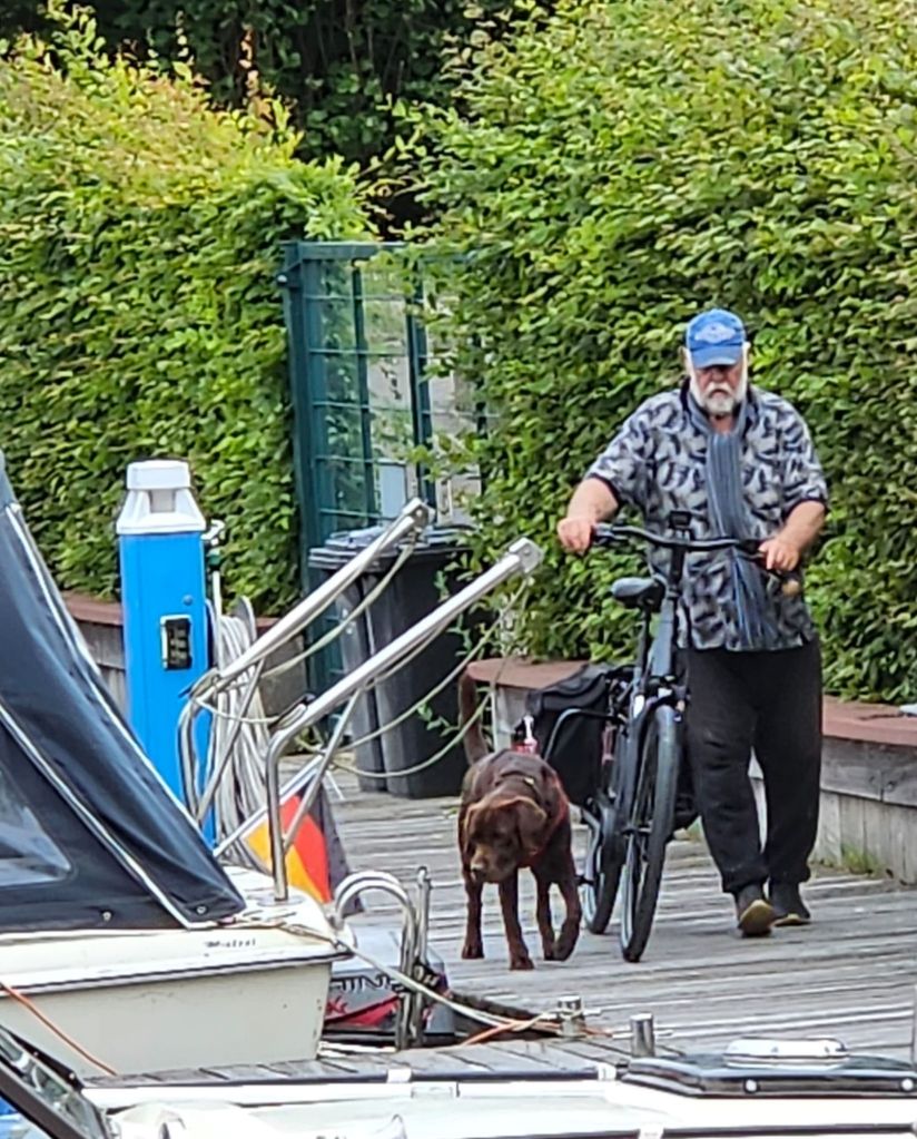 Na ruim een uur gaat de brug open voor een ander schip en loop ik op deze man af die aan de andere kant van het water de brug bedient. Uiteindelijk komt hij naar ons toe na het sluiten van de brug. Toen wij aankwamen was het net lunchtijd (spertijd) en dacht hij dat we daarna door zouden varen maar toen we er nog steeds lagen vermoede hij dat we bleven liggen. Er waren geen passanten meer en mensen van buitenaf waren op de steiger geweest waarvan de hond op de steiger gepoept had. Dus alle hekken op slot gedaan.