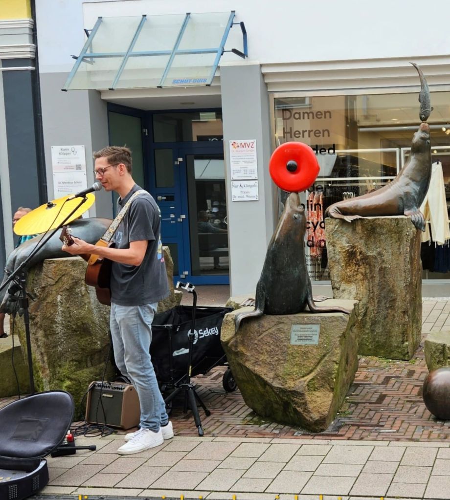 Een straatmuzikant tussen de zeehonden.Een schaap wat op de kippetjes past.Blijf van die knie af.