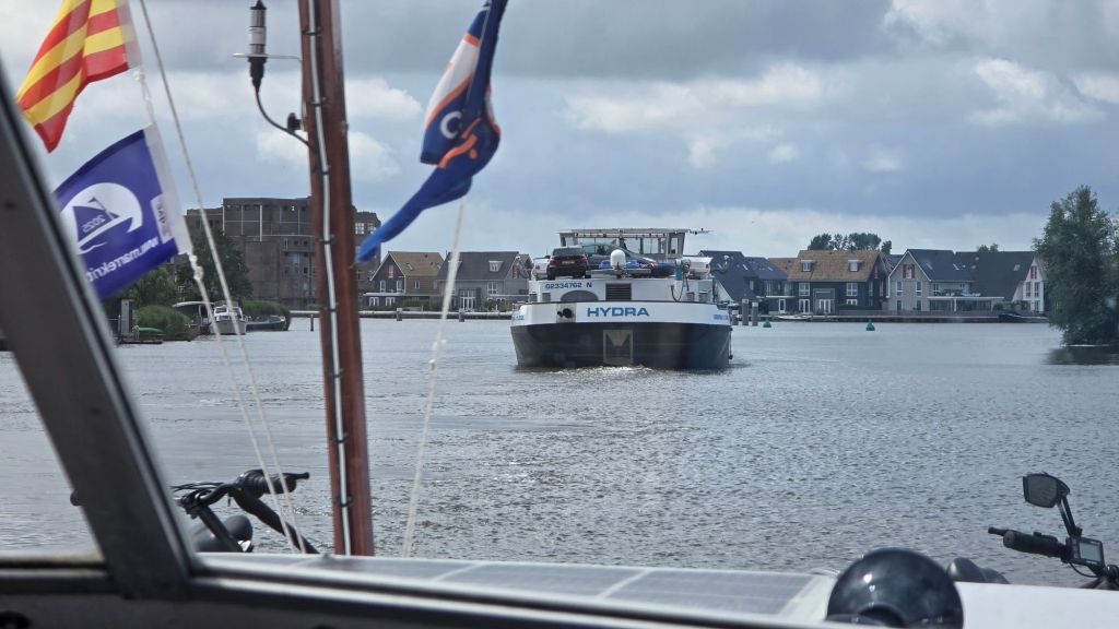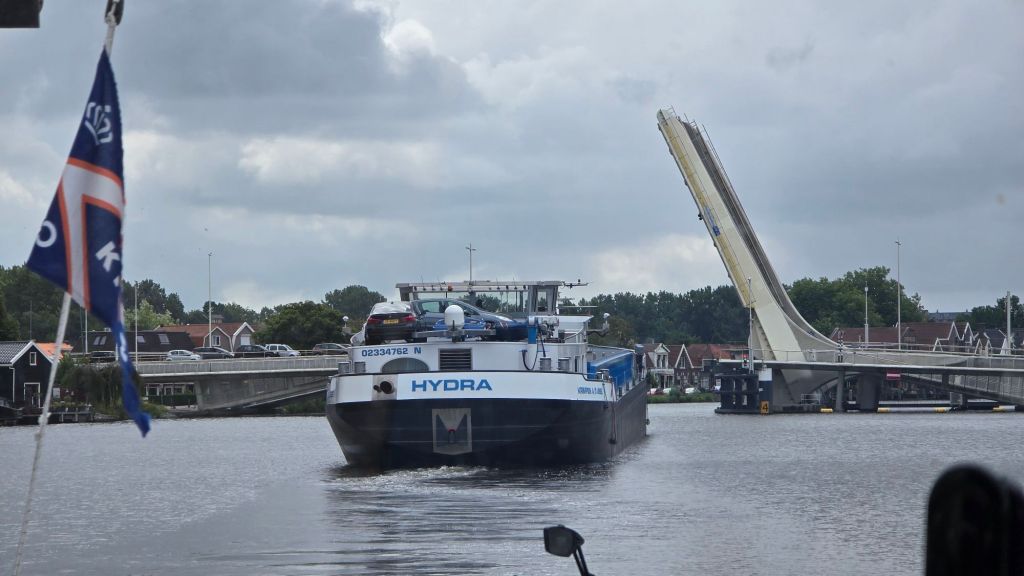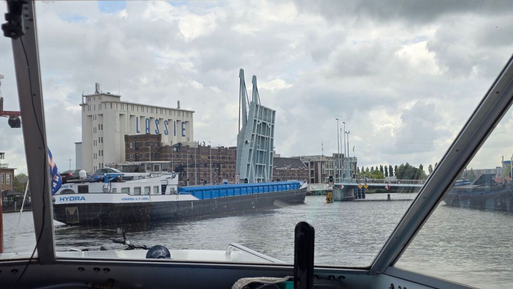 Het voordeel is nu aan onze kant. Het is een leeg vrachtschip, meestal houden ze er flink de vaart in. Elke brug gaat nu snel open.