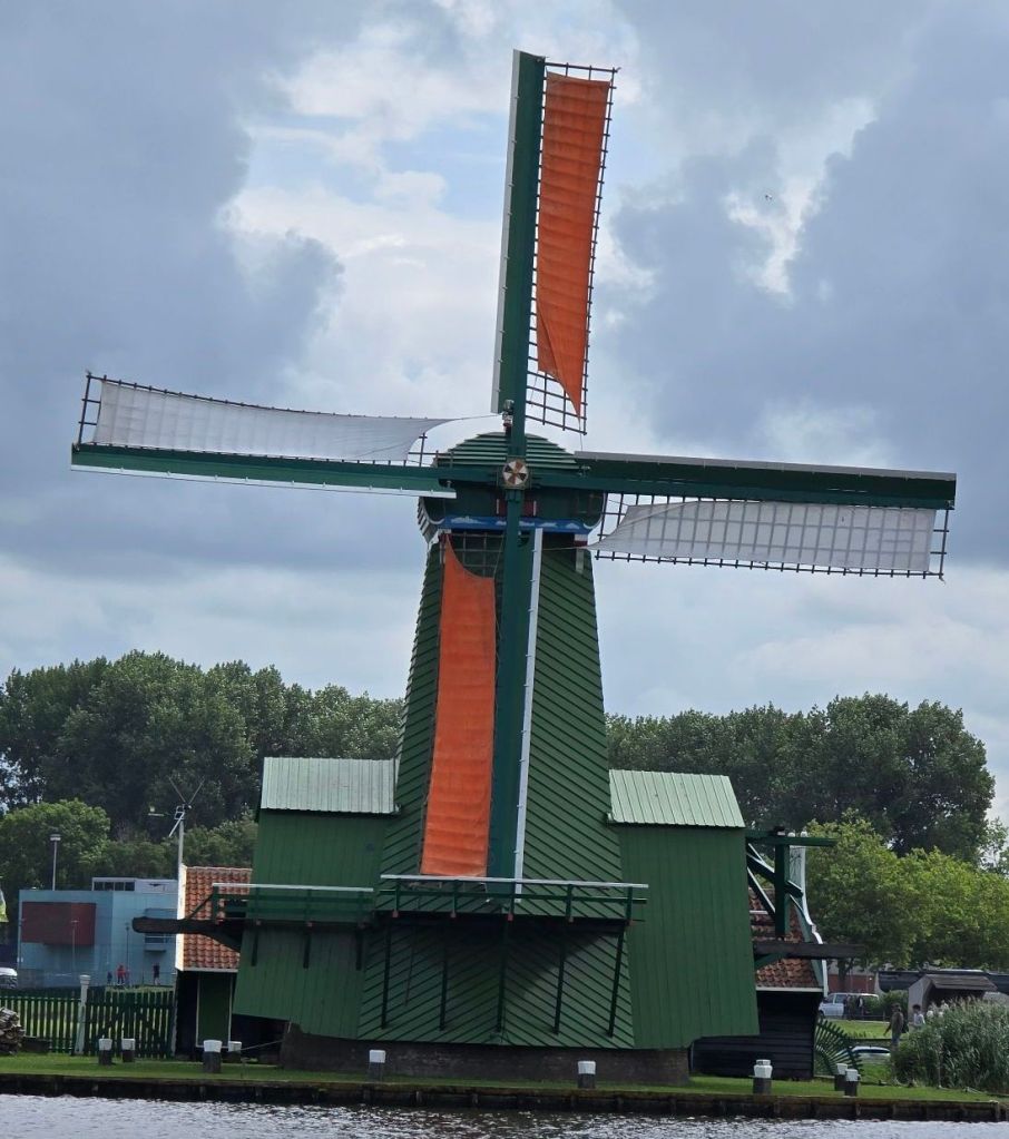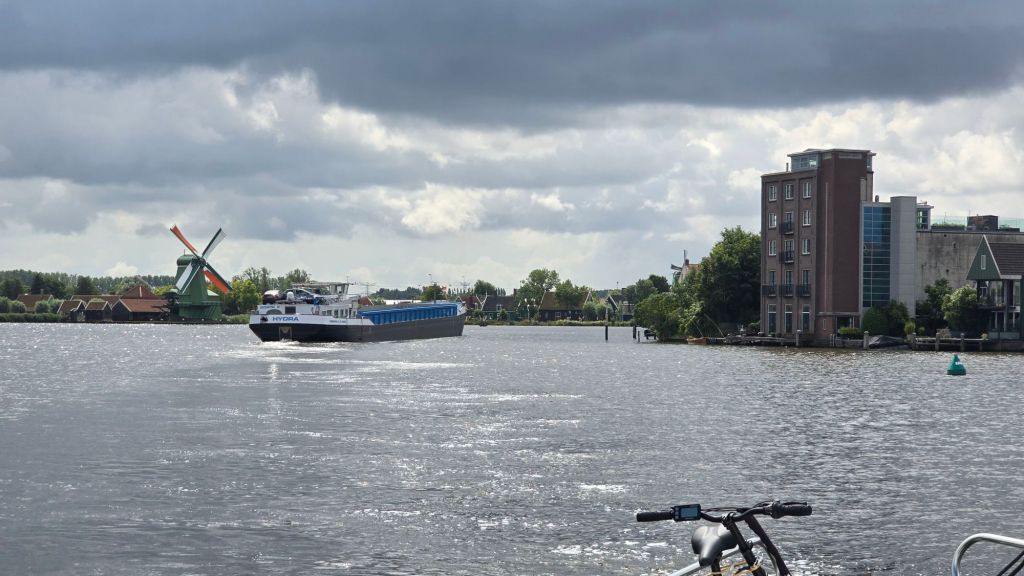 Het waait behoorlijk, zelfs onder de tent voel je de koude dwarswind. Bij de Prinses Amaliabrug, bij West Knollendam, hebben we wel contact met de brugwachter maar er komt geen actie voor het openen. Het is daar een ongelooflijke windhoek, de boot is bijna niet te houden en Arie blijft continue rondjes draaien. Op een gegeven moment zie ik een vrachtschip achter ons aankomen. We horen de schipper oproepen en de brug gaat spoedig open. We laten het vrachtschip voorgaan en dan snel ook door de brug.
