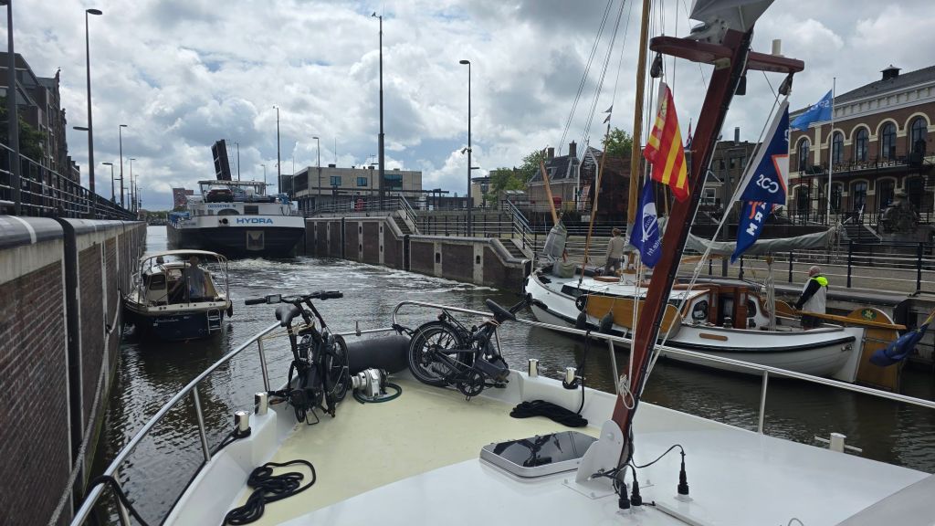 Bij de sluis moet de brug ook open. Het vrachtschip vaart de kolk in en meteen schieten daar achteraan nog wat (wachtende) kleine bootjes. Nu moet de brug langer openblijven omdat wij moeten wachten op die bootjes. 🙄