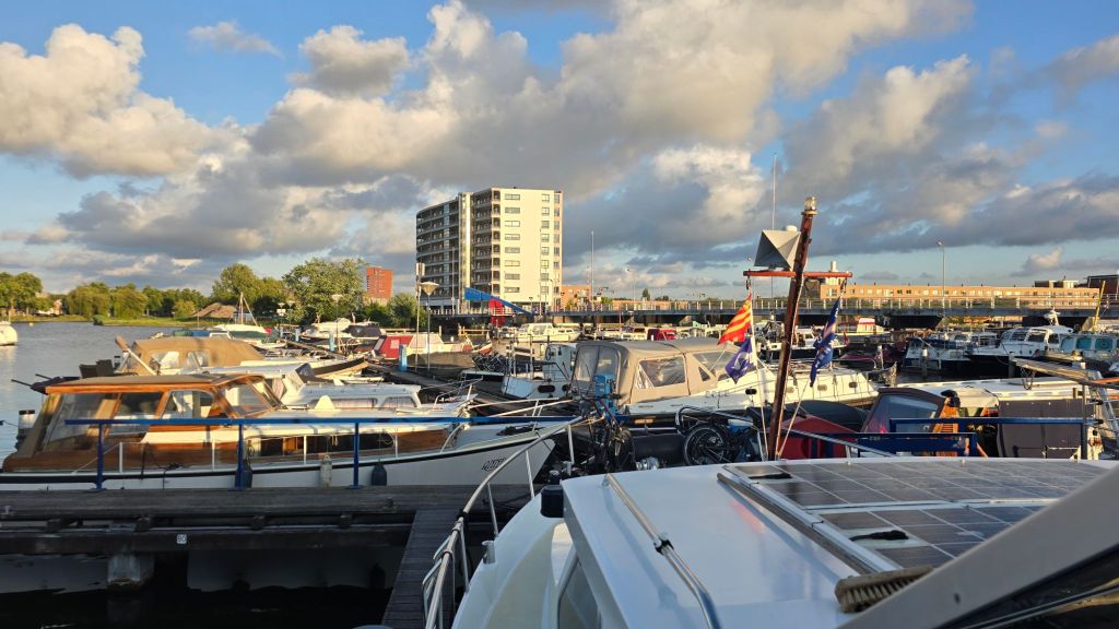 Na de sluis meren we af bij jachthaven de Remming. Met een flinke dwarswind komen we gelukkig ongeschonden de box in. Daarna zijn we nog een stief kwartiertje bezig met het goed leggen van de boot. Helaas een te korte vingersteiger, met het trapje kunnen we toch van en aan boord.