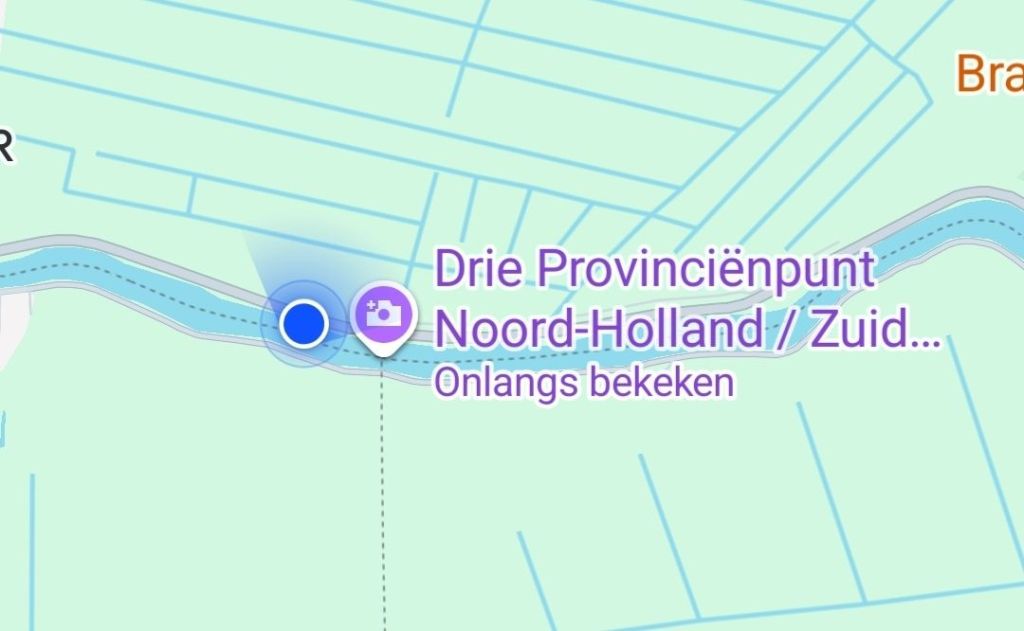Wat blijkt, liggen we precies bij het 3 provinciënpunt. Tussen De Kwakel in Noord-Holland en Vrouwenakker in Zuid-Holland, op de grens met Utrecht, ligt het drie provinciënpunt midden in de Amstel.