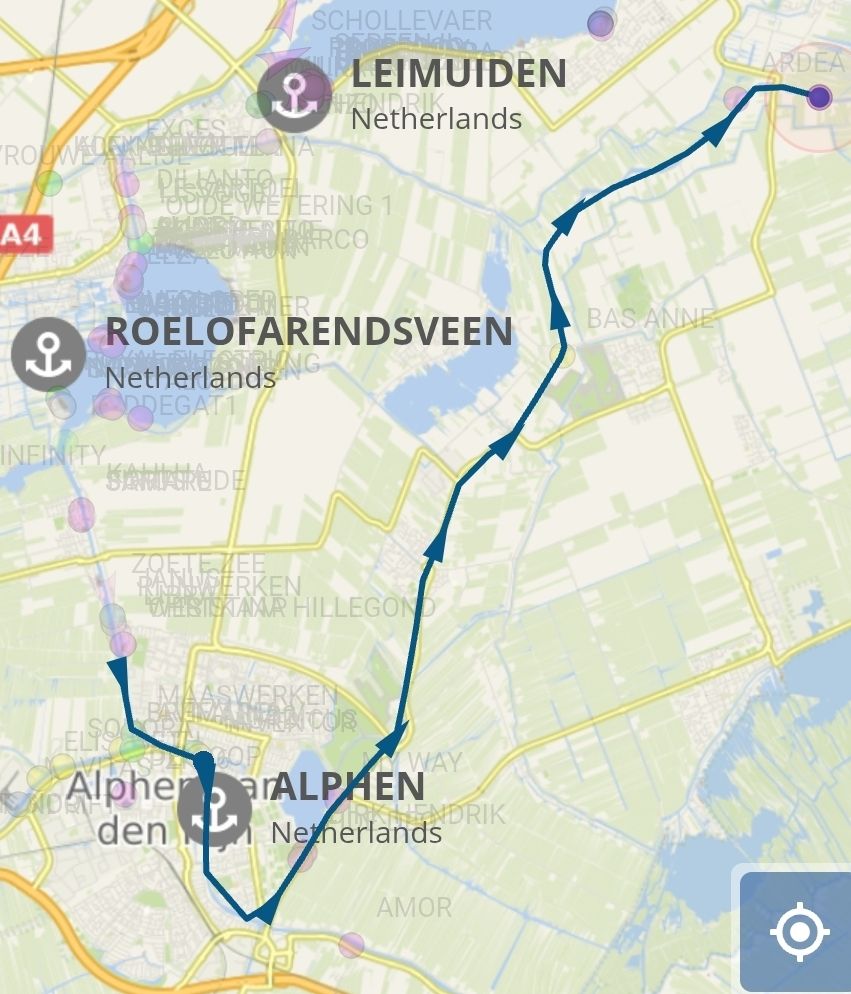 Inmiddels is het zonnetje doorgebroken en voelt het weer heel aangenaam, ondanks de wat venijnige wind. Wanneer we in de buurt van Uithoorn komen gaan we voor een plekje zoeken. De eerste hele kleine haven ligt op open terrein. Geen zin in. Een paar bochten verder komt er een vrije ligplaats heerlijk achter bomen. Dat wordt het voor vannacht.