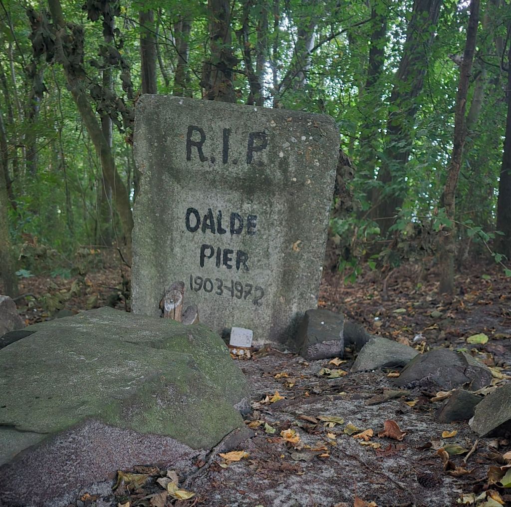 Lang verhaal kort: Oalde Pier had in de jaren 70 van de vorige eeuw dit eiland ontwikkeld voor de watersport voor beschutting, rust en ruimte, een vooruitziende blik. Watersporters hebben later in de bosjes dit graf of grafsteen gevonden en opgeknapt. Het graf gaat de geschiedenis in als toonbeeld van dankbaarheid aan de oprichter van dit eiland.