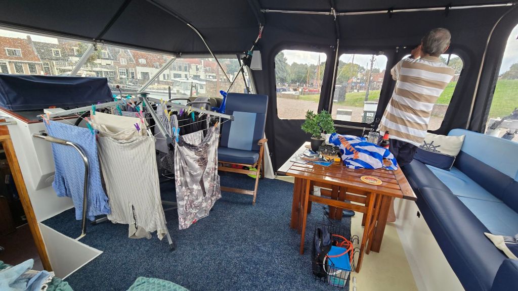 Boodschappen doen bij de Jumbo, op de fiets en genoeg tassen mee. Bepakt en bezakt terug naar de boot, het is dan bijna half 4 als we de eerste druppels voelen. Dat wordt racen met opruimen.