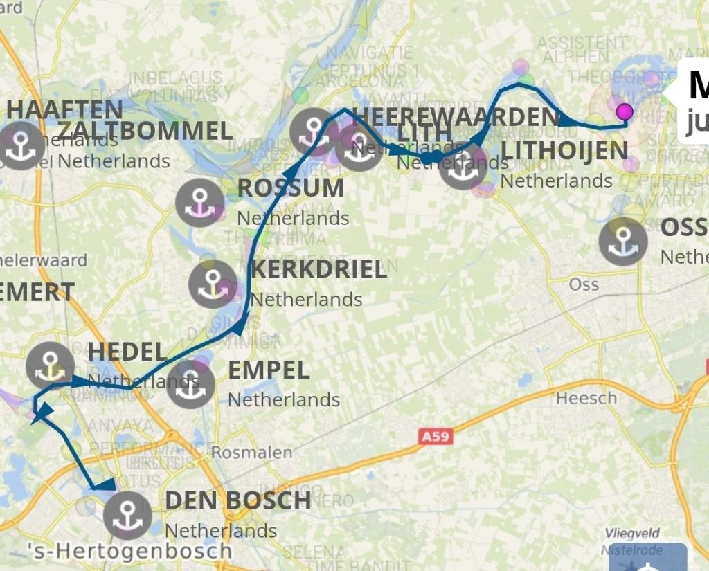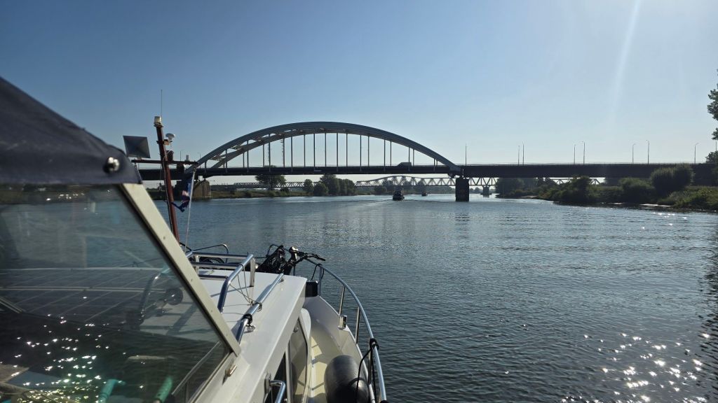 De reis gaat voorspoedig, het weer is prachtig en we hebben een lekker gangetje. Tot we bij sluis Lith komen. Daar zien we bij de sportsteiger dat deze geheel gevuld is met wachtende watersporters. Er liggen ook 2 vrachtschepen. Gelukkig kan de Vigor nog aan de kant liggen en wij dan langszij.