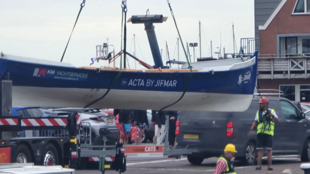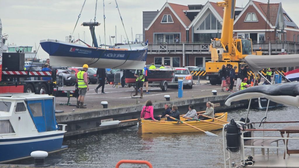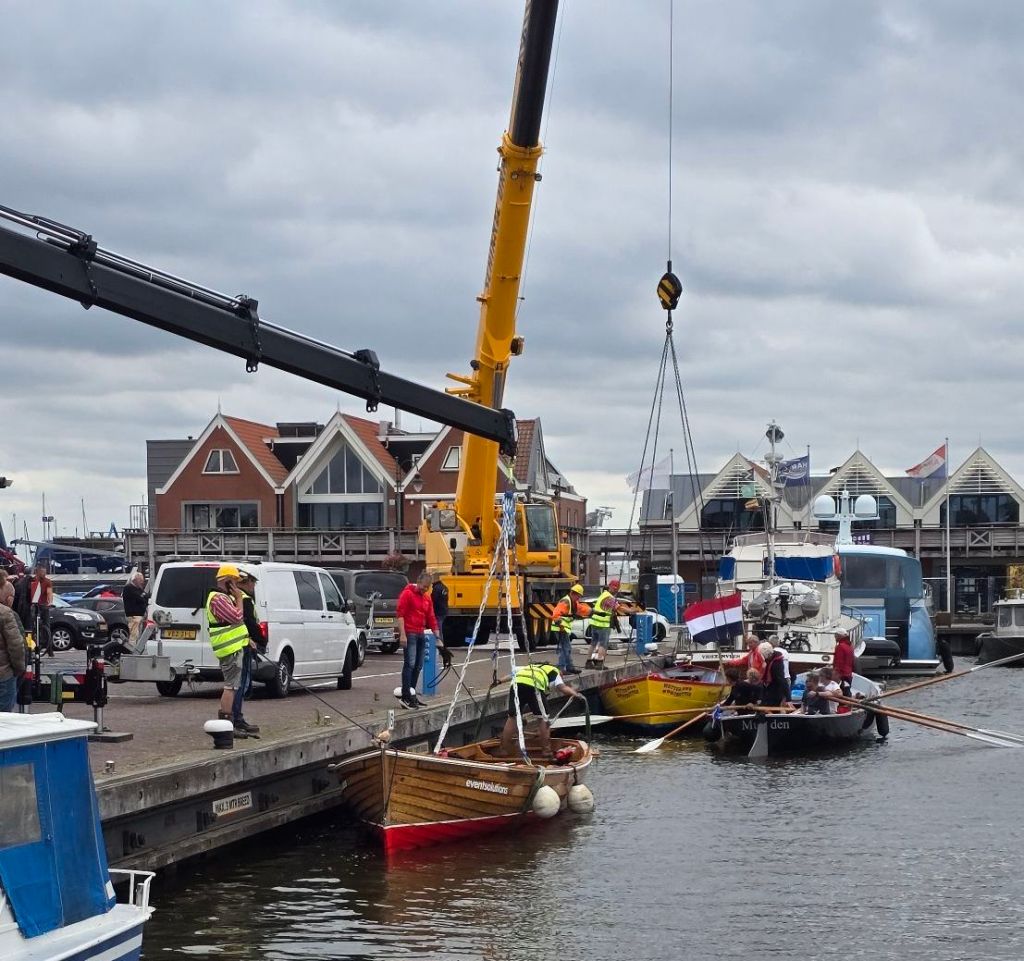 Op de parkeerplaats van de bussen komen twee kranen. Spannend en dus lekker beschut in onze tent kijken wat er gaat gebeuren. Dan wordt de één na de andere sloep te water gelaten.