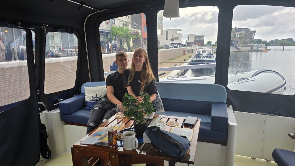Onderwijl, we varen dan al op de randmeren blijft het aan één stuk regenen, ook in de sluis. Dan een appje waar of we zijn en of we visite aan boord kunnen hebben. Iedereen is welkom, maar dan wel zelf mooi weer meenemen.