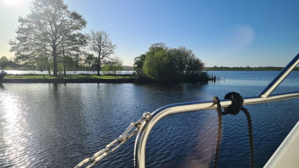 Als ik even na 8 uur wakker wordt is het stil. Geen regen. Wel hoor ik de touwen iets kraken, er staat een licht briesje. Ook hoor ik de vogels kwetteren, een duif laat zich horen en ik hoor de eenden te water springen. Als ik opsta is het koud, heel koud. De thermometer geeft 6 graden aan. Snel de nieuwe sloffen aan en badjas. Dan in de salon zie ik het zonnetje schijnen. Prachtig.