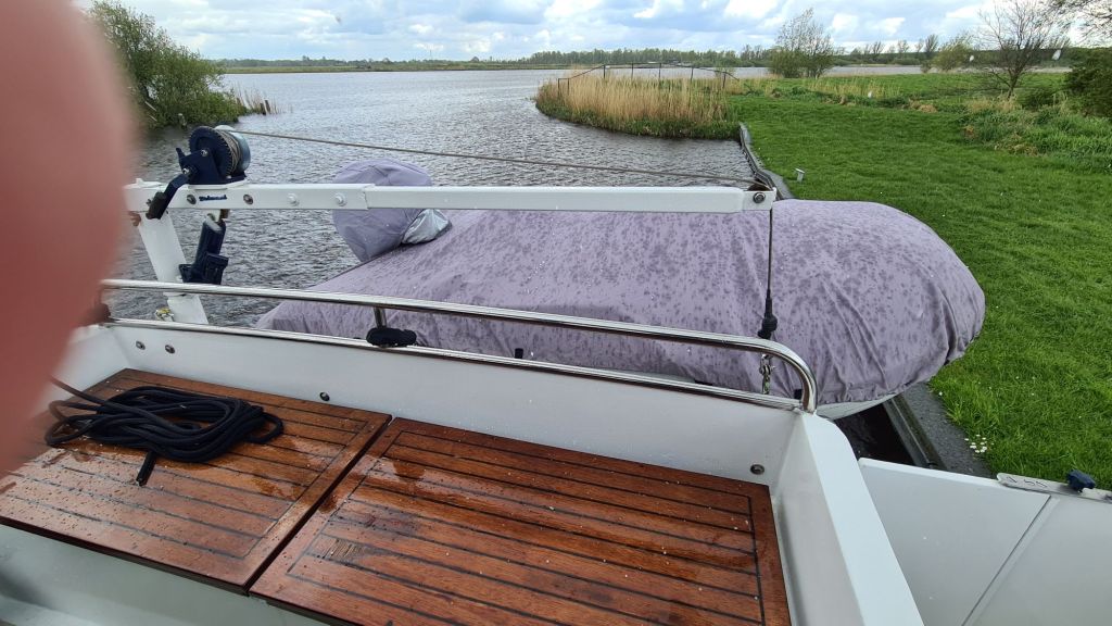 Al gauw zit ik boven onder de tent, heerlijk die zon. Bakkie thee er bij, broodje, en genieten. Als Arie er bij komt stelt hij voor om niet verder te varen maar even met het bijbootje een rondje te maken vanmiddag. Strak plan, hebben we die ook meteen getest. We trekken de achterflap open, temperatuur onder de tent is inmiddels 22 graden.
