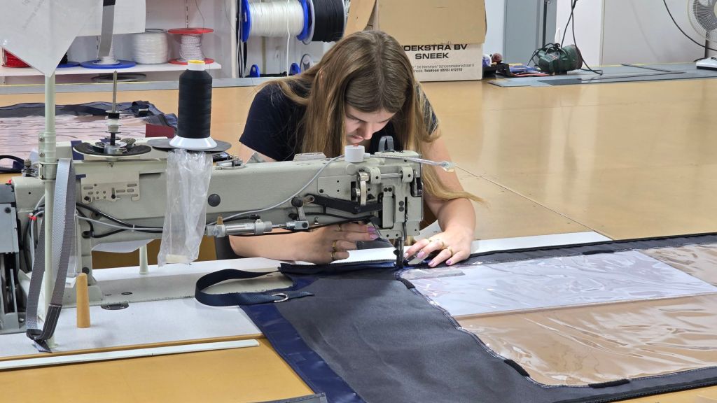 Om half 10 zijn we richting de Zeilmakerij gefietst, 2 achterflappen mee zodat ze nu recht genaaid kunnen worden. Een beetje eigen schuld want toen deze band er op gezet werd hadden we de flap die er naast zit niet meegenomen.