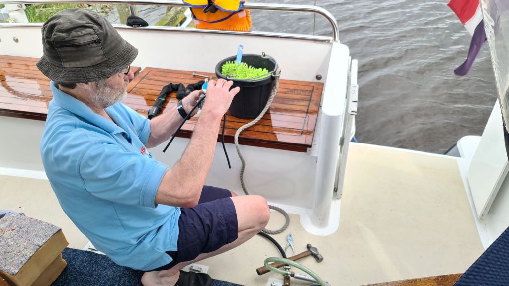 De buitenboordmotor wil het niet meer doen, starten, ho maar. Geen leven in te krijgen. Na drie uur ploeteren is Arie er klaar mee. Dan begint het ook hier weer te spetteren en word alles weer opgeruimd en ingepakt. Slot er op. Klaar.