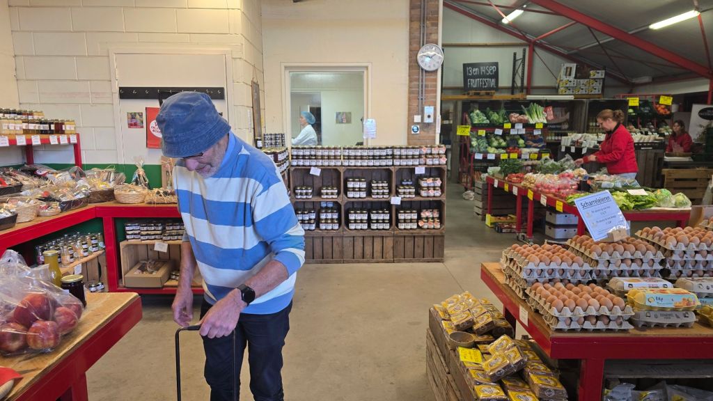 Verleden jaar waren we hier geweest. Heel veel lekkere en gezonde lekkernijen, ook van andere boerderijen bij elkaar. Met een karretje vol bij de kassa. Rugtas vol en het laatste stukje fietsend terug naar de boot.