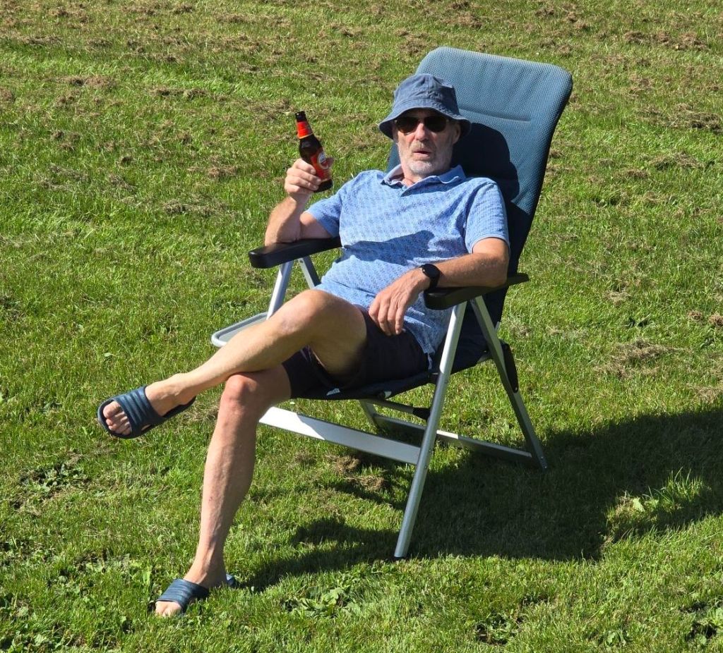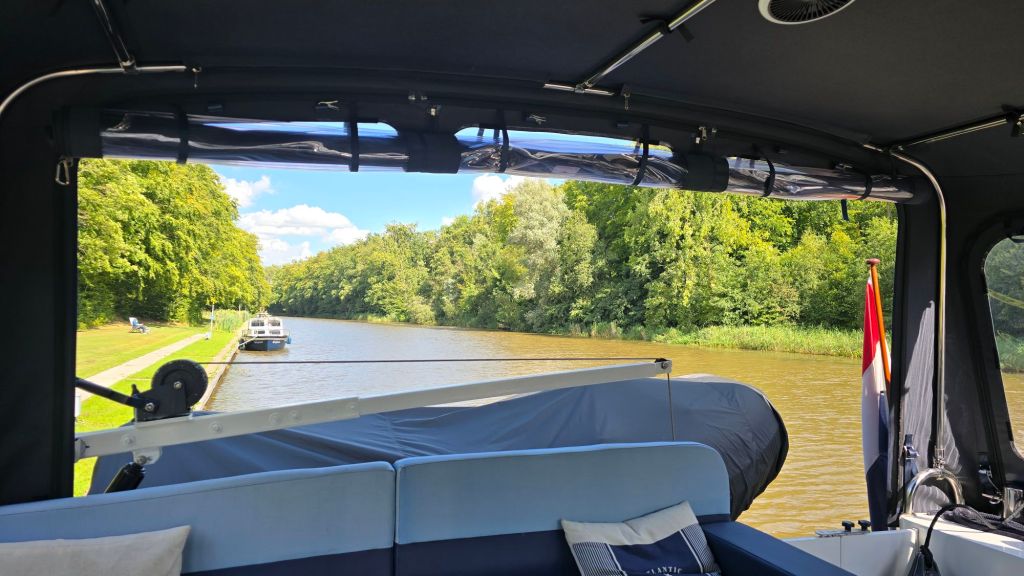 Hoewel het heerlijk weer is, maakt het windje het toch koud, trui en vest waren geen overbodige luxe. Zodra we bij de boot zijn kan de tent meteen weer open en korte broek aan. We liggen hier kostelijk uit de wind.