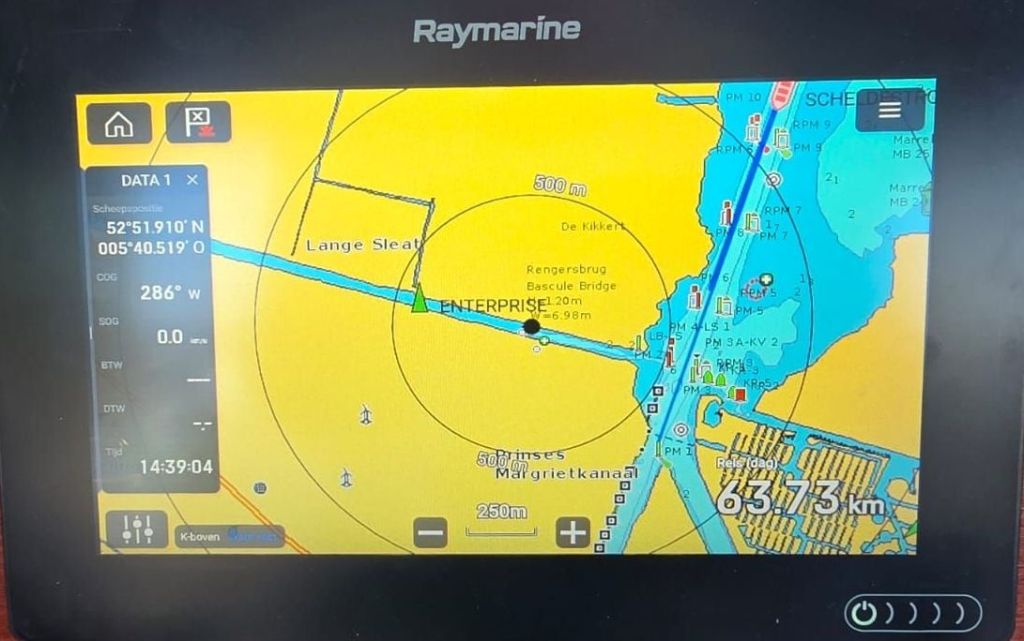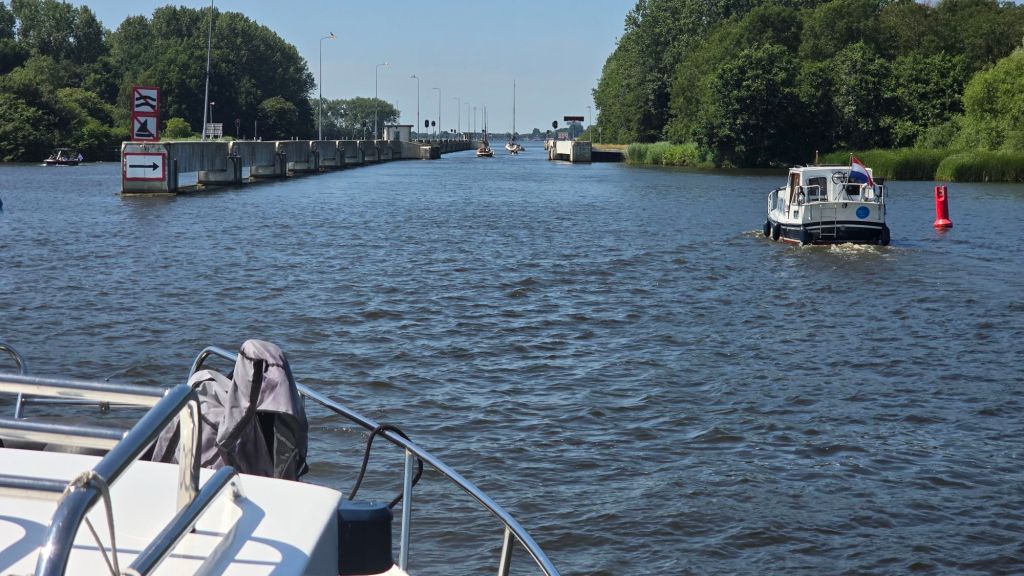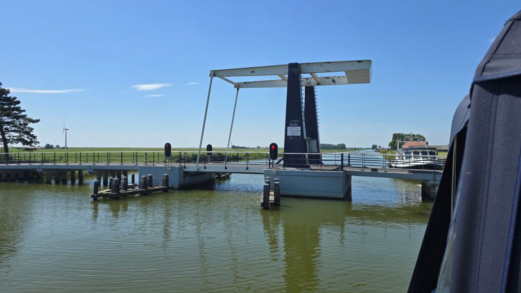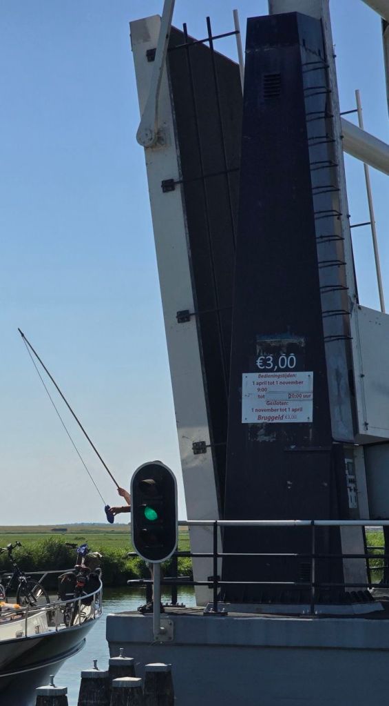 Als ik het geld in het klompje doe vraag ik meteen of hier nog ergens vrije plekken zijn. “Jawel” zegt de brugwachter en wijst een plek aan voor de brug. Meteen de vraag erachteraan of we meteen kunnen keren en terug door de brug daar gaan liggen. Ook geen probleem.