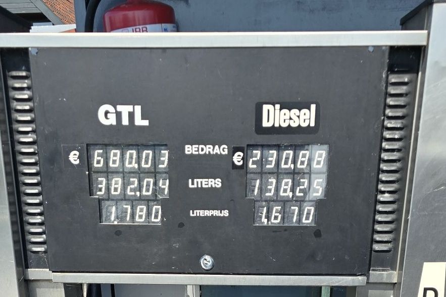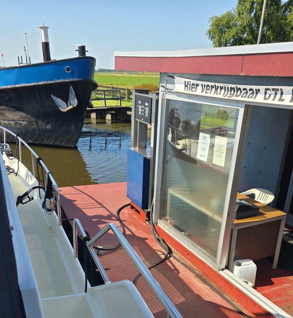Voor ons is het tanken bij Fonejacht het voordeligst en aangezien we er toch langs komen dan ook meteen maar weer aanvullen. Volgens Arie kan er ongeveer 200/250 lieter bij. Afijn, bijna 400 liter verder. 😉