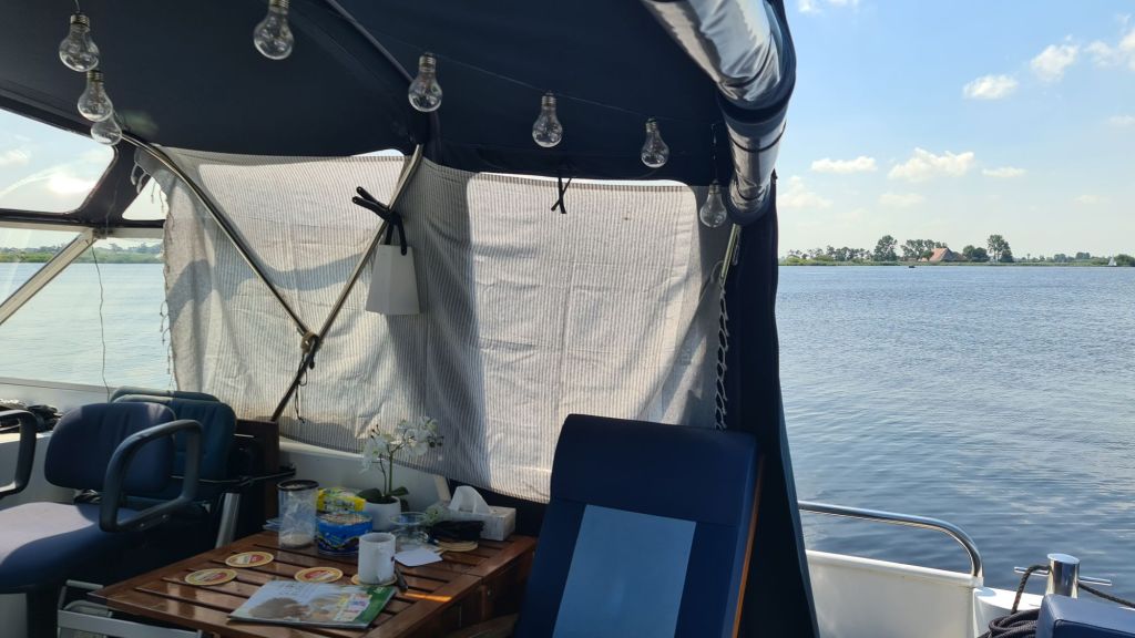 We hebben ook altijd wat te klagen. Is het eindelijk zonnig gaan we schaduw maken. Onder de tent geeft de thermometer 34 graden aan.