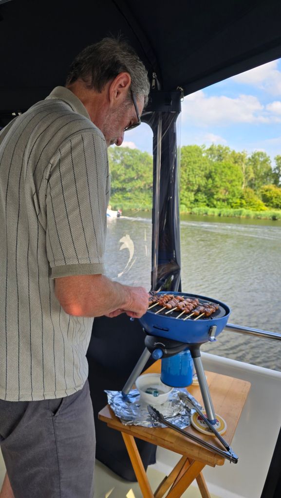 Gelukkig had Arie voor die tijd de kip al gemarineerd. Alleen nog rijgen, partygrill aan en heerlijk zitten eten.