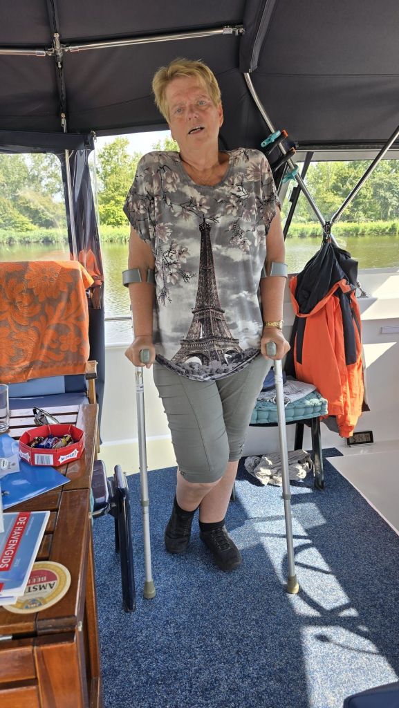 Uitslag: gewoon uitzitten, het is een onderdeel van de slijtage van mijn knie. Pijnstillers, pootje hoog en voldoende rust nemen. Mocht het volgende week niet over zijn, dan een afspraak maken. Het bestuurslid heeft ons weer naar de haven gebracht, de vrouw van de havenmeester had nog krukken staan. Met de rolstoel terug naar de boot.
