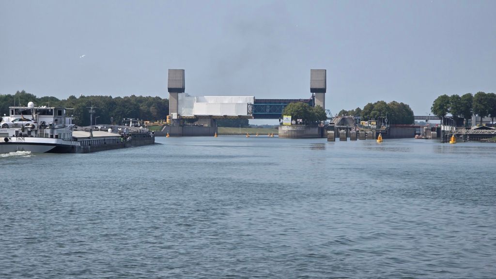Om 12.55 draaien we bij Tiel het Amsterdam-Rijnkanaal op. Daar ligt een schip wat eerder bij ons in de andere sluis lag, gas op de plank gaf en nu hier ligt te wachten. Er komen nog twee vrachtschepen bij en gaan we door de Bernhardsluis. 15 km redelijk snel gevaren toch nog.