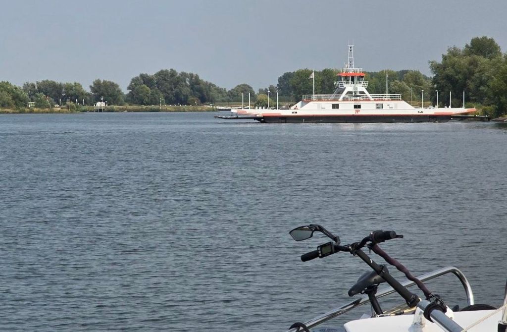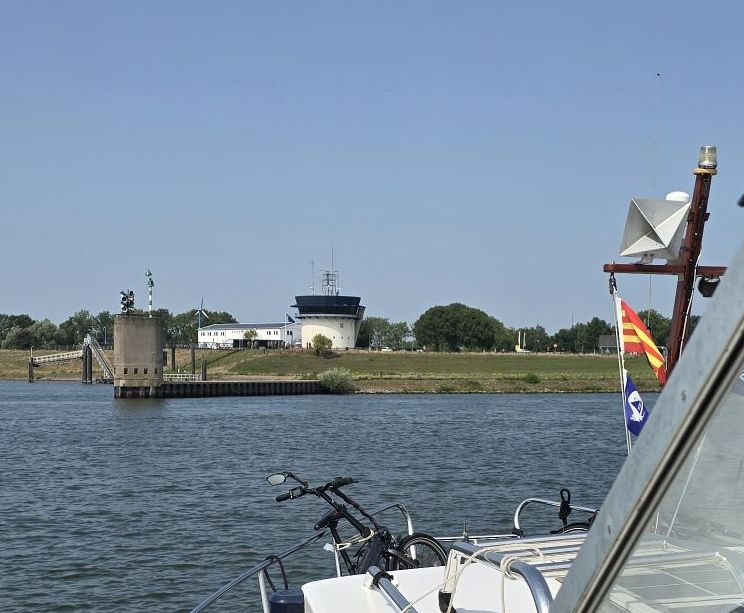 Het zicht op de sluis houden we tot 10.30, de sluiswachter wacht op beroepsvaart aan de andere zijde. In het laatste kwartiertje zijn er 6 bootjes bijgekomen. Het schutten gaat voorspoedig en om 11.20 draaien we de Waal op. We gaan nu tegenstrooms varen. De motor draait 2200 toeren en dan nog komen we met een gangetje van 8 km vooruit. Menig vrachtschip haalt ons in. Een dikke 6baksduwboot vaart achter ons, met een halve km meer dan ons, benieuwd of die ons ook inhaalt. Niet dus.
