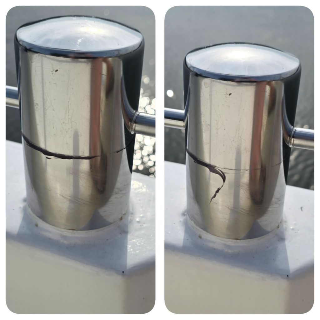 Het leek dat we toch wat schade hadden na het hangen in de sluis. Gelukkig niet, wat afdruk van het touw dat er strak omheen gezeten had. Kan het er met mijn nagel afhalen. 🧐