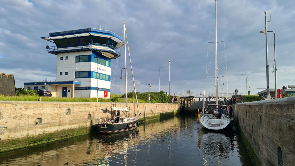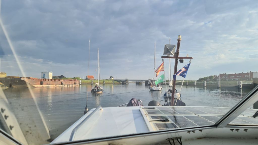 Voor ons, na een kwartiertje varen, de sluis om van het IJsselmeer naar de Waddenzee te varen. Er zijn alleen nog een aantal zeilboten die ook die kant opvaren.