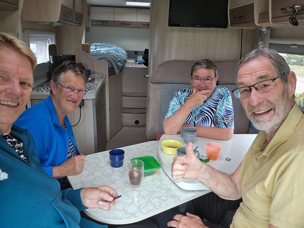 Even appen en bellen en 2 uur later, de regenbui afgewacht, fietsen gepakt en zijn we op visite bij Carla en Bea. We hadden het er wel vooraf aan de vakantie over gehad, maar nooit kunnen bevroeden dat we zo dicht bij elkaar in de buurt waren. Het was heel gezellig.