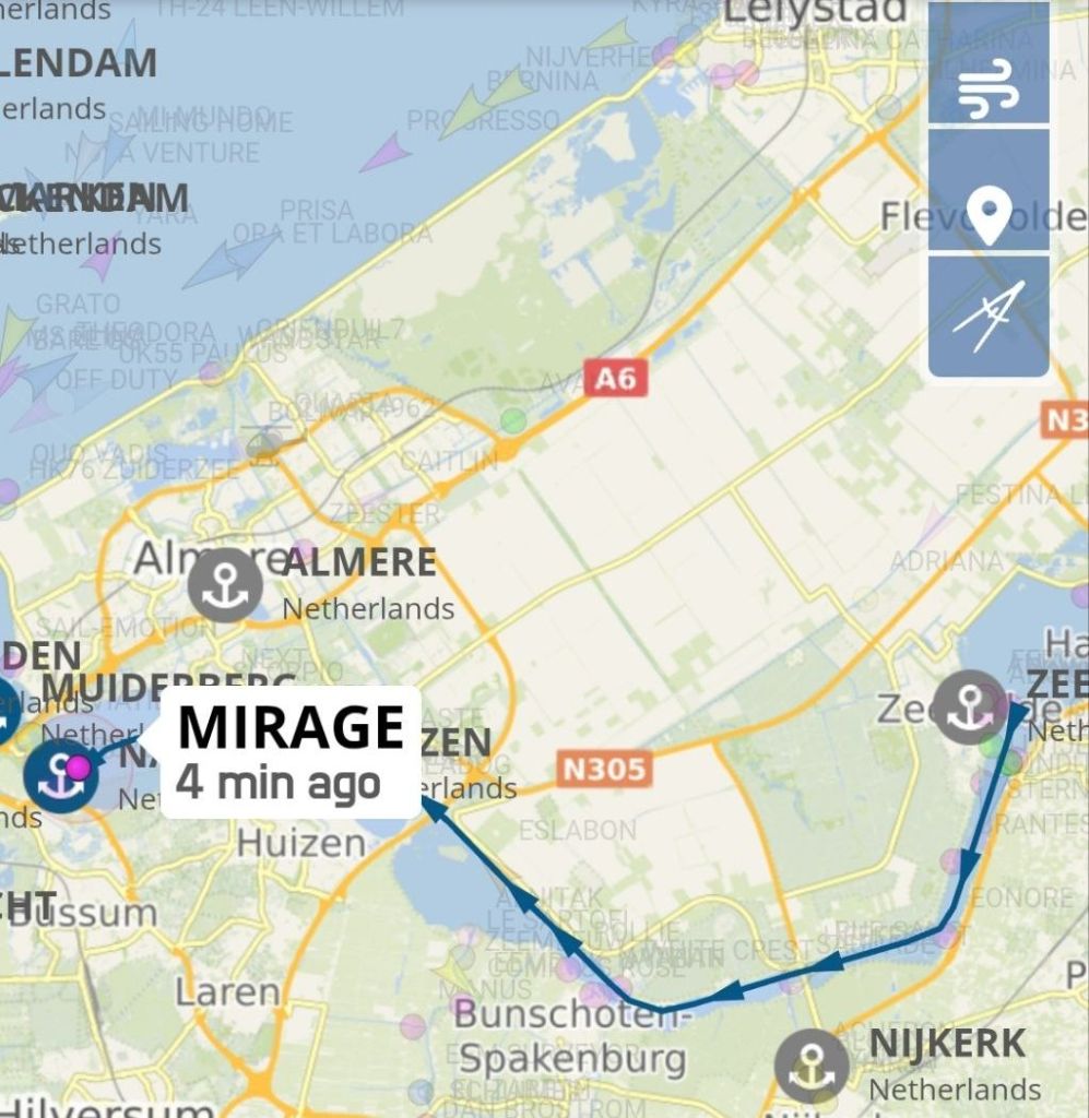 Ergens rond half twee zijn we uiteindelijk toch gaan varen. Er staat een straffe wind, kracht 5, op de kop. Soms wat regen. Op dit tijdstip is een ligplaats op de Schelp geen garantie meer. Dan varen we eventueel een klein stukje door naar de Jachthaven in Naarden.