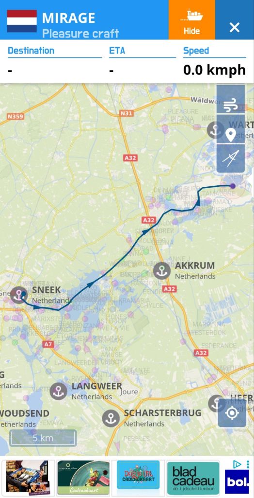 Allereerst hebben we nu ook AIS . Verplicht voor de beroepsvaart maar ook steeds meer gebruik in de watersport. Voorgaande jaren keken we wel via AIS apps wie er om ons heen voeren, zeker wanneer we op druk bevaarde rivieren waren, nu zijn we zelf ook zichtbaar voor de beroepsvaart en andere watersporters. Bovenstaande afbeelding laat zien wat we vandaag gevaren hebben. Voor wie niet bekend is met AIS maar ons wel wil volgen, dan is Vesselfinder een makkelijke gratis app.