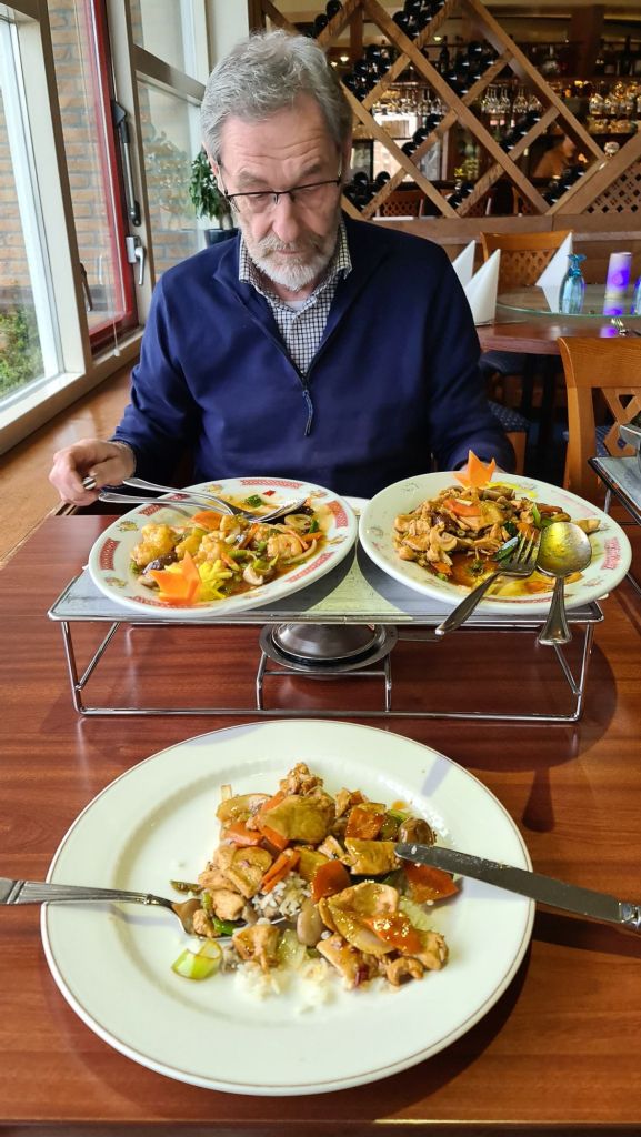 Na een paar uur rondwalen en met moeie voeten een kleine lunch genomen en terug naar de boot. Het is nog droog maar guur en koud. Om de dag dan nog verder te vervolmaken gaan we daarna uit eten bij de plaatselijke chinees.