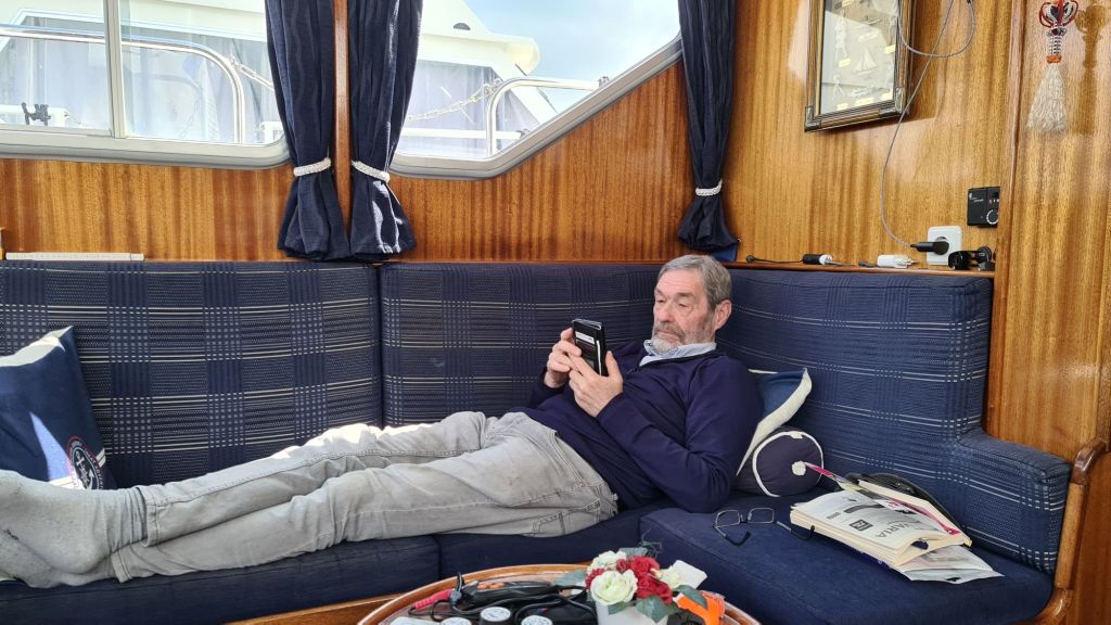 Tot op heden nog geen berichtje dat de accu’s klaar staan. We zitten al de hele dag binnen met de kachel aan, zelfs het achterdek onder de tent heeft afgedaan. Het waait behoorlijk, kracht 5 met uitschieters, dus als we gebeld zouden zijn hadden we het toch doorgeschoven naar morgen, dan is er minder wind. Nu liggen we af en toe flink te klotsen in de box.