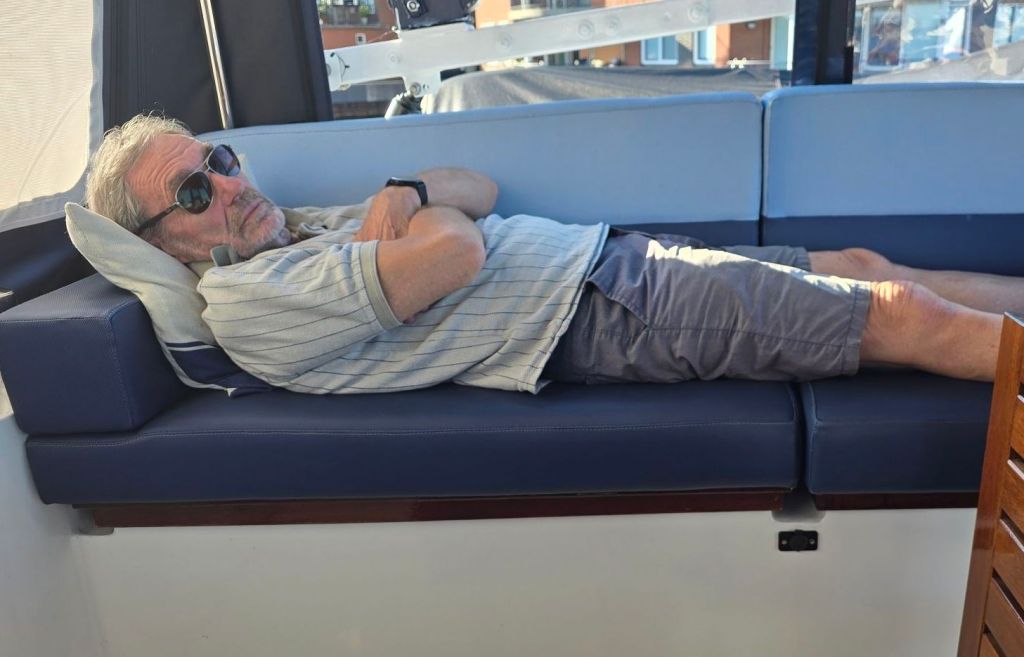 Het is weer heerlijk warm, we zagen de verschillen bij de weerberichten dat het in het noorden bewolkter was. De drie grote screens van de achterkant tent passen ook prima bij de ramen voor.