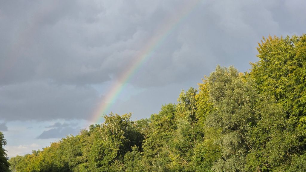 Maar ook nu komt de volgende bui, die was kort maar hevig. De zon komt meteen te voorschijn en boven de bomen zien we de regenboog.